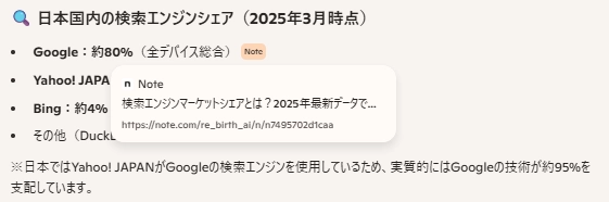 たとえば、「検索エンジンの国内シェア」をAIに質問した際、信頼性の高い公式データではなく、個人のブログや「note」記事などを根拠として挙げてしまう場合もあり得ます。たとえ「信頼性の高い数値を引用してください」と指示しても、AI側がどの情報を一次ソースとみなしているかを見極める必要があります。